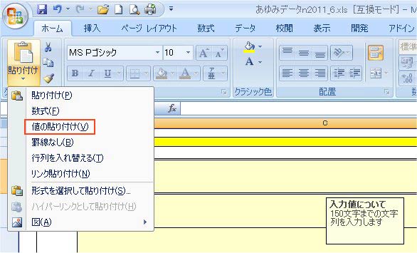 5)[ホーム]→[貼り付け]→[値の貼り付け]を選択し貼り付けます。