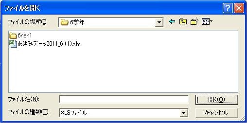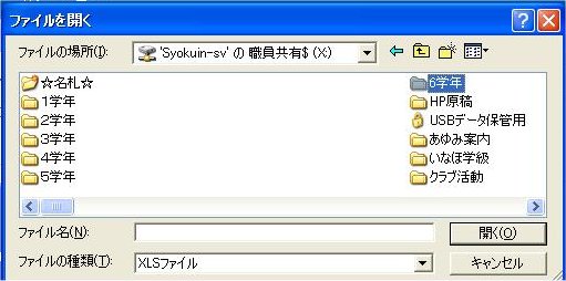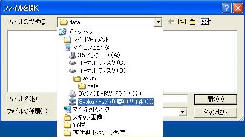 2)[‘Syokuin-sv’の職員共有$(X:)]ドライブ→「あゆみ」データを入力している「あゆみデータファイ ル」がある 「data」フォルダ内→「あゆみデータ*201*_*.xls」データファイルを選択→[開く (O)]をクリックします。
