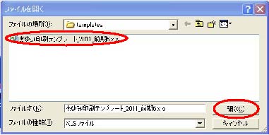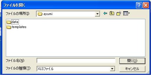 [ ローカルディスク(D)] 内の[ayumi]を選択し→ [開く(O)]をクリック→「templates」を選択し → [開く(O)]をクリック→フォルダ内の「あゆみ印刷テンプレート*2011_*.xls」を選択し→